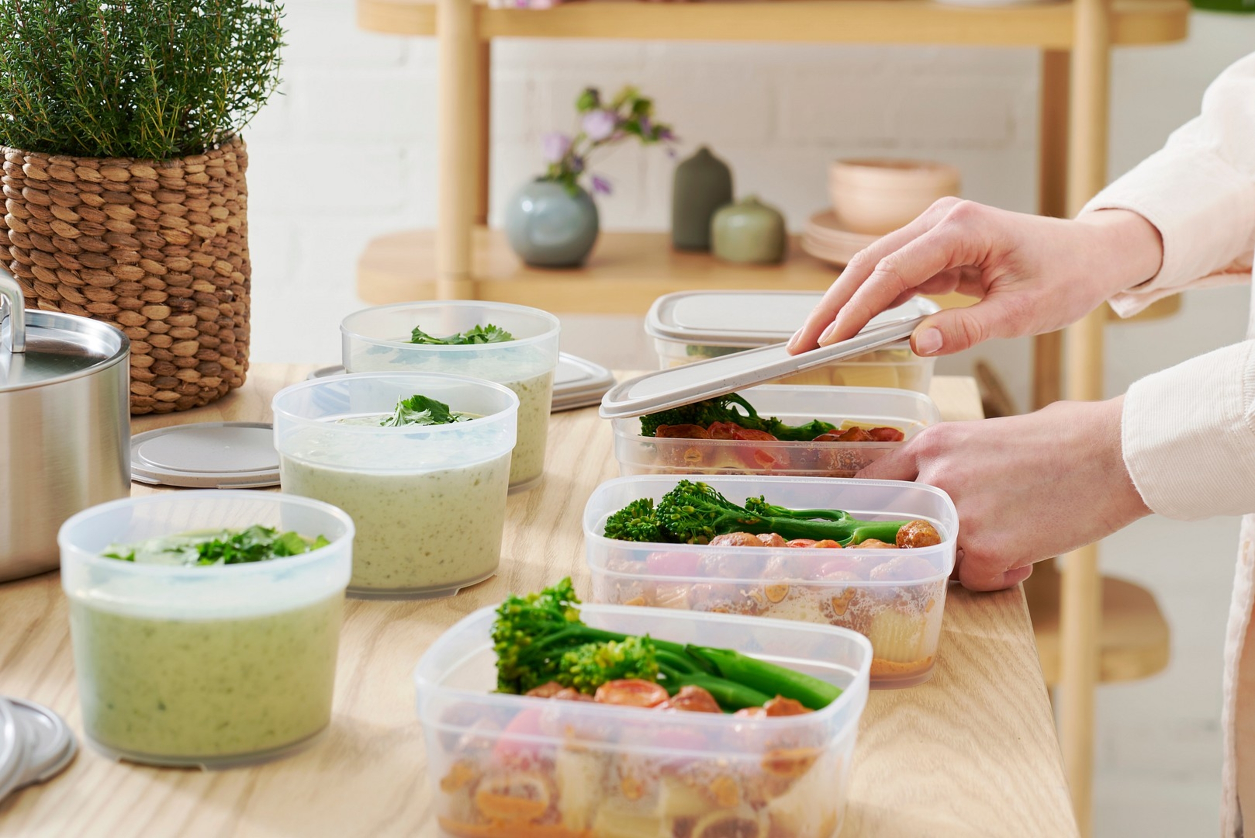 Matförvaringsbehållare som är utformade för att hålla maten fräsch i kylen eller för att äta lunch på språng. De lufttäta, läckagefria behållarna hjälper till att hålla maten fräscsh längre, vilket även minskar matsvinnet.