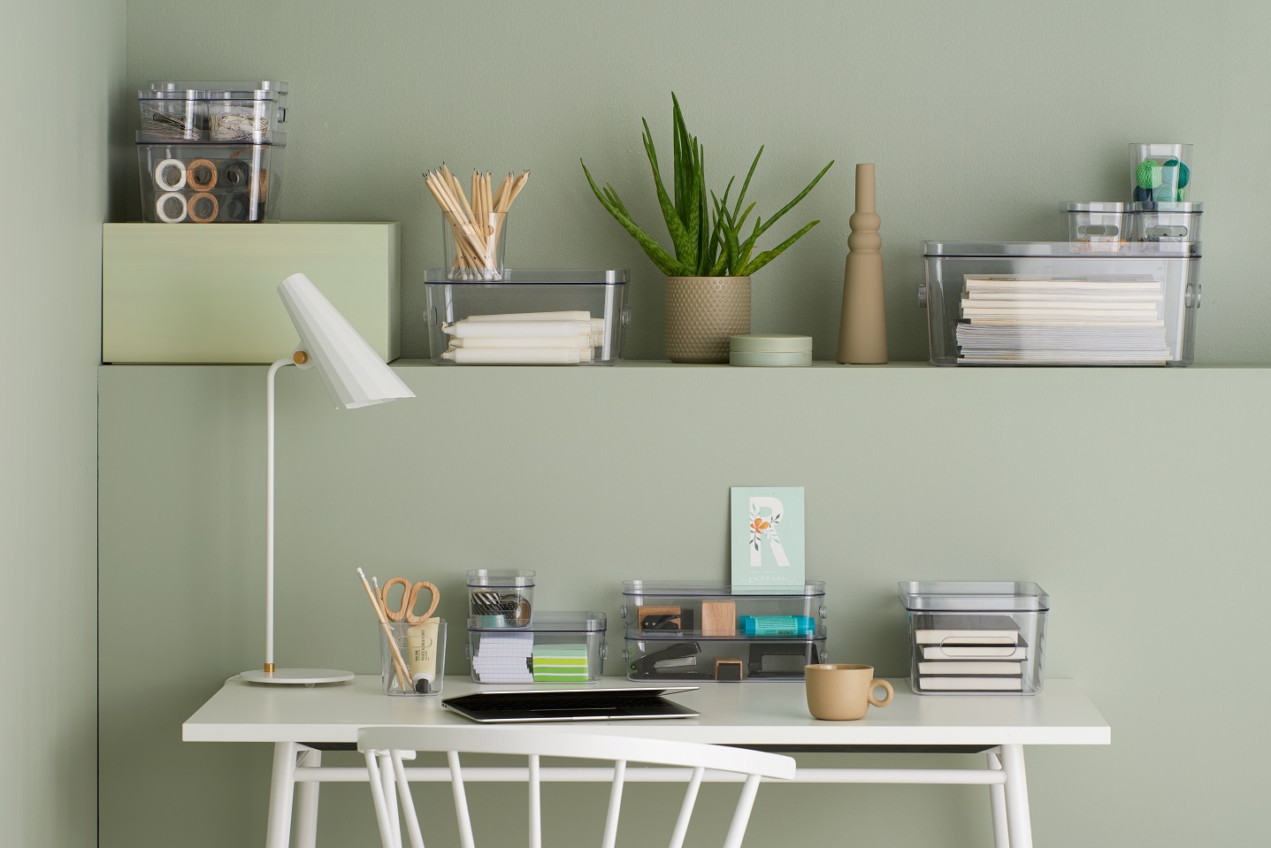 I vårt stora utbud av storlekar inom SmartStore™ Classic finns en mängd olika förvaringslådor som passar på kontoret. Insatser gör det lätt att organisera de små sakerna, och med etiketter märker du snabbt upp vad varje låda innehåller.